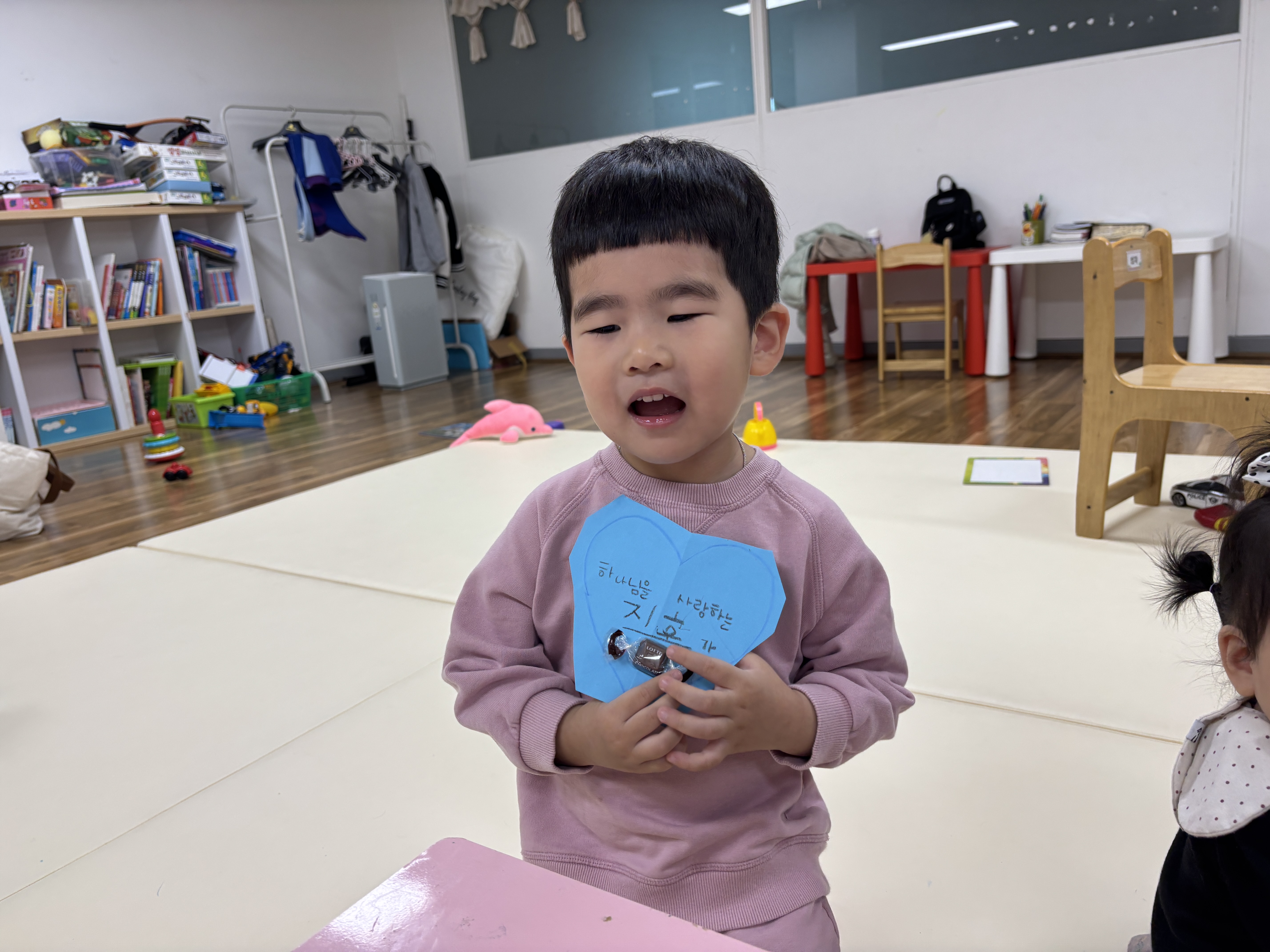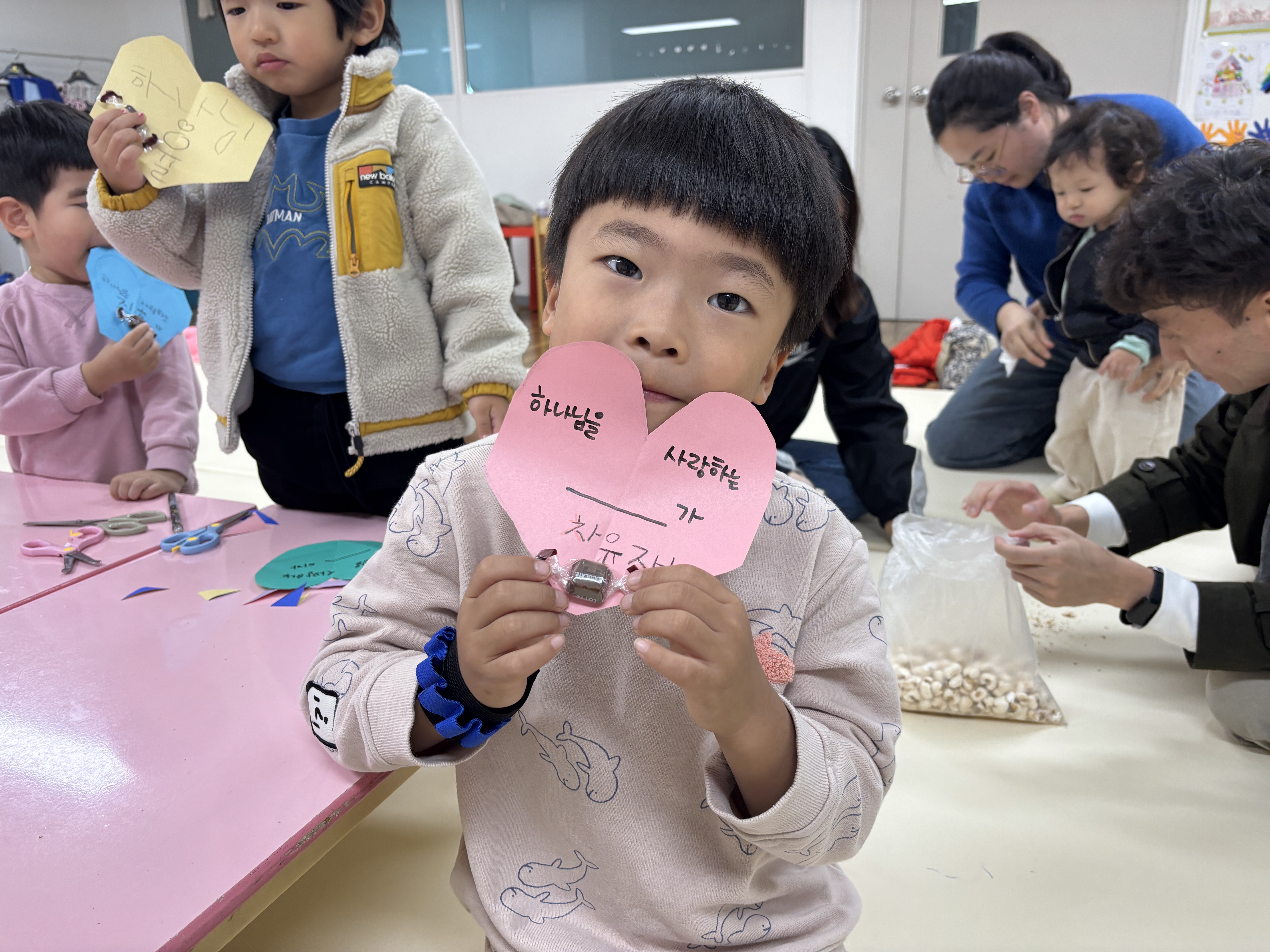 오늘의 설교는 마태복음 5장 16절을 본문으로 “하나님을 보여주며 살아요”라는 제목으로 진행되었습니다. 이후 있었던 유치부 공과 공부는 김민희 선생님의 지도 하에 우리 아이들이 살아 계신 하나님을 전하기 위한 활동(친구에게 전달할 초콜릿 담은 하트 만들기)을 진행하였습니다.