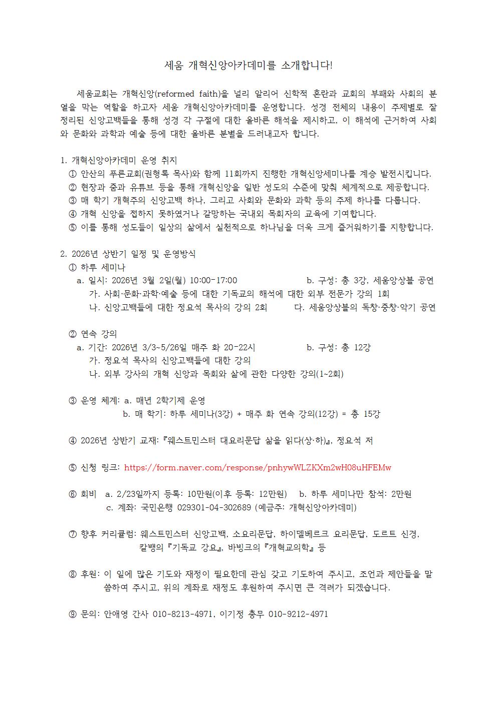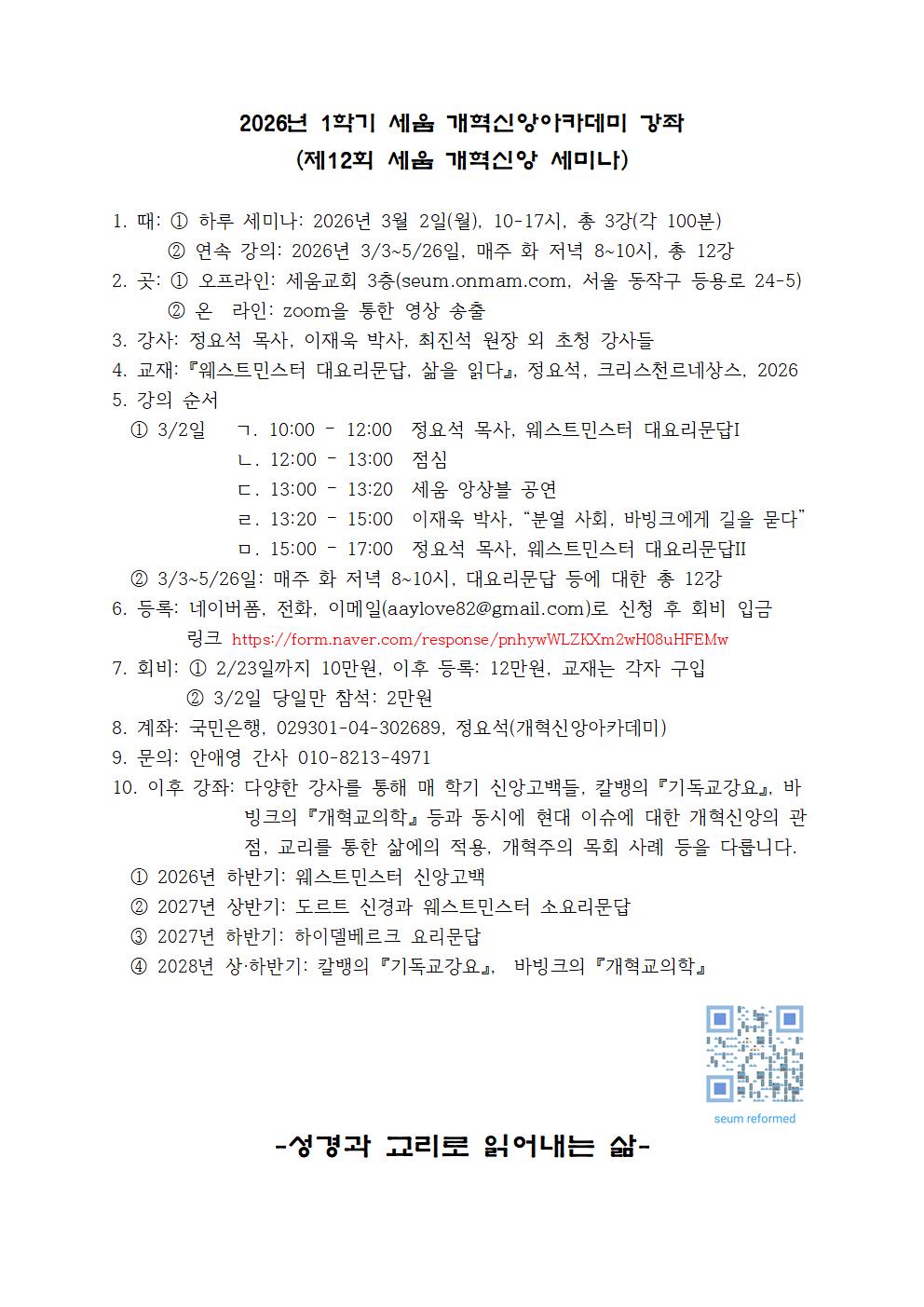 세움 개혁신앙아카데미를 소개하니 많이 격려하여 주시고, 좋은 조언도 해주시기 바랍니다! 세움교회는 개혁신앙(reformed faith)을 널리 알리어 신학적 혼란과 교회의 부패와 사회의 분열을 막는 역할을 하고자 세움 개혁신앙아카데미를 운영합니다. 성경 전체의 내용이 주제별로 잘 정리된 신앙고백들을 통해 성경 각 구절에 대한 올바른 해석을 제시하고, 이 해석에 근거하여 사회와 문화와 과학과 예술 등에 대한 올바른 분별을 드러내고자 합니다. 1. 개혁신앙아카데미 운영 취지 ① 안산의 푸른교회(권형록 목사)와 함께 11회까지 진행한 개혁신앙세미나를 계승 발전시킵니다. ② 현장과 줌과 유튜브 등을 통해 개혁신앙을 일반 성도의 수준에 맞춰 체계적으로 제공합니다. ③ 매 학기 개혁주의 신앙고백 하나, 그리고 사회와 문화와 과학 등의 주제 하나를 다룹니다. ④ 개혁 신앙을 접하지 못하였거나 갈망하는 국내외 목회자의 교육에 기여합니다. ⑤ 이를 통해 성도들이 일상의 삶에서 실천적으로 하나님을 더욱 크게 즐거워하기를 지향합니다. 2. 2026년 상반기 일정 및 운영방식 ① 하루 세미나 a. 일시: 2026년 3월 2일(월) 10:00–17:00 b. 구성: 총 3강, 세움앙상블 공연 가. 사회·문화·과학·예술 등에 대한 기독교의 해석에 대한 외부 전문가 강의 1회 나. 신앙고백들에 대한 정요석 목사의 강의 2회 다. 세움앙상블의 독창·중창·악기 공연 ② 연속 강의 a. 기간: 2026년 3/3~5/26일 매주 화 20–22시 b. 구성: 총 12강 가. 정요석 목사의 신앙고백들에 대한 강의 나. 외부 강사의 개혁 신앙과 목회와 삶에 관한 다양한 강의(1~2회) ③ 운영 체계: a. 매년 2학기제 운영 b. 매 학기: 하루 세미나(3강) + 매주 화 연속 강의(12강) = 총 15강 ④ 2026년 상반기 교재: 『웨스트민스터 대요리문답 삶을 읽다(상·하)』, 정요석 저 ⑥ 회비 a. 2/23일까지 등록: 10만원(이후 등록: 12만원) b. 하루 세미나만 참석: 2만원 c. 계좌: 국민은행 029301-04-302689 (예금주: 개혁신앙아카데미) ⑦ 향후 커리큘럼: 웨스트민스터 신앙고백, 소요리문답, 하이델베르크 요리문답, 도르트 신경, 칼뱅의 『기독교 강요』, 바빙크의 『개혁교의학』 등 ⑧ 후원: 이 일에 많은 기도와 재정이 필요한데 관심 갖고 기도하여 주시고, 조언과 제안들을 말씀하여 주시고, 위의 계좌로 재정도 후원하여 주시면 큰 격려가 되겠습니다. ⑨ 문의: 안애영 간사 010-8213-4971, 이기정 총무 010-9212-4971
